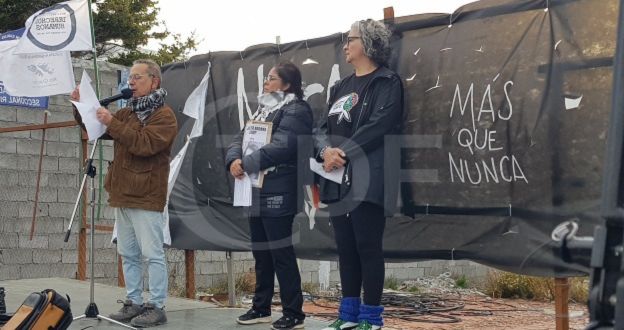 El extractivismo y las dictaduras necesitaron, y aún necesitan, del miedo para imponer y llevar adelante el despojo, el mismo que hoy intentan sembrar persiguiendo, amenazando, criminalizando, encarcelando y censurando para que dejemos de defender la vida. Por eso la lucha es junto a los pueblos originarios quienes son estigmatizados, despojados de su identidad, de sus tierras, perseguidos y asesinados en todo el territorio nacional. No nos olvidamos que nuestra provincia fue fundada sobre un genocidio, cientos de familias selk’nam fueron perseguidas, capturadas, esclavizadas, asesinadas, deportadas y despojadas de sus territorios. A pesar de más de 140 años de violencia el pueblo selk’nam está vivo, presente y en lucha por la verdad, la justicia y en defensa de la tierra que habitamos.
