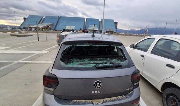 Vehículos estacionados en el aeropuerto Malvinas Argentinas amanecieron con sus vidrios rotos debido al temporal de viento.
