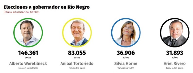 Con un 88% de las mesas escrutadas, el partido Juntos Somos Río Negro (JSRN) retuvo la gobernación por otros cuatro años: Alberto Weretilneck superó el 40 por ciento de los votos (con colectoras) frente al 24 por ciento del candidato de Juntos por el Cambio, Aníbal Tortoriello.