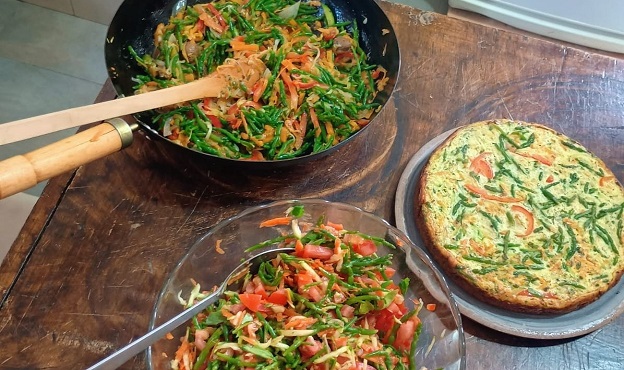 La propuesta continuó con un taller práctico de cocina, en el que se elaboraron distintas preparaciones con salicornia cruda y cocida, entre ellas tortilla, pasta corta con salteado y alioli.